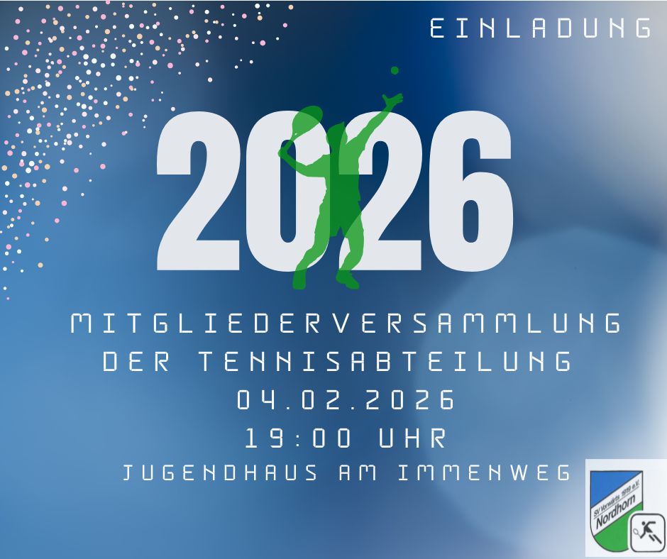 Liebe Tennisfreundinnen und Tennisfreunde, wir laden euch herzlich zu unserer Mitgliederversammlung mit Vorstandswahlen ein. Datum: 04.02.2026 ⏰ Uhrzeit: 19:00 Uhr Ort: Jugendhaus am Immenweg Gemeinsam blicken wir auf die Saison zurück und stellen mit